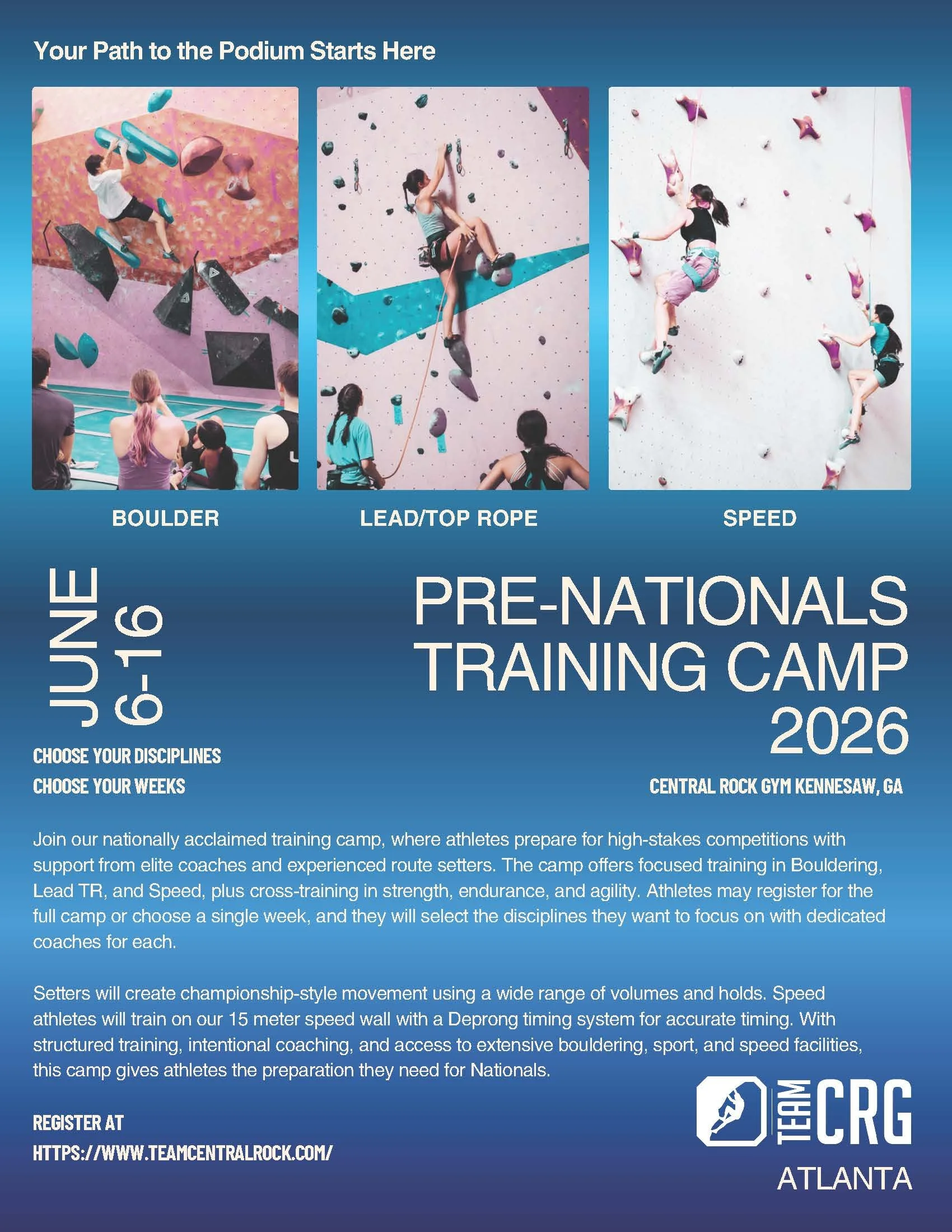 Athletes will refine skills across all three disciplines—Bouldering, Lead/TR, and Speed—while also participating in targeted cross-training focused on strength, endurance, agility, and movement efficiency.